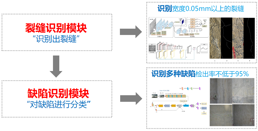 2、基于旋转不变形的目标检测算法,基于对抗生产网络的语义分割算法,极大的提高了裂缝,缺陷的识别率。