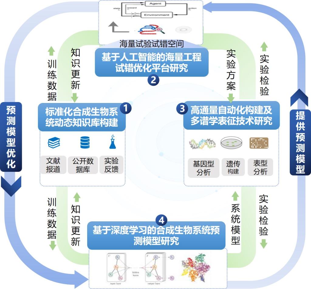 项目分解为四大任务:(1)标准化合成生物系统动态知识库构建;(2)基于人工智能的海量工程试错优化平台研究;(3)高通量自动化构建及多谱学表征技术研究;(4)基于深度学习的合成生物系统预测模型研究。